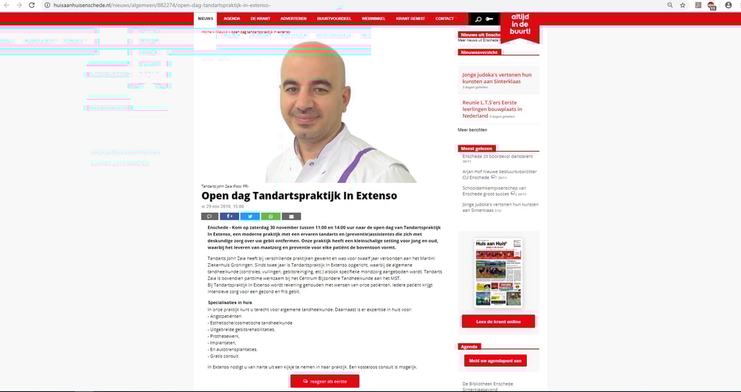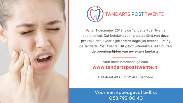 - De Tandarts Post Twente is operationeel met ingang van zaterdag 1 december 2018.