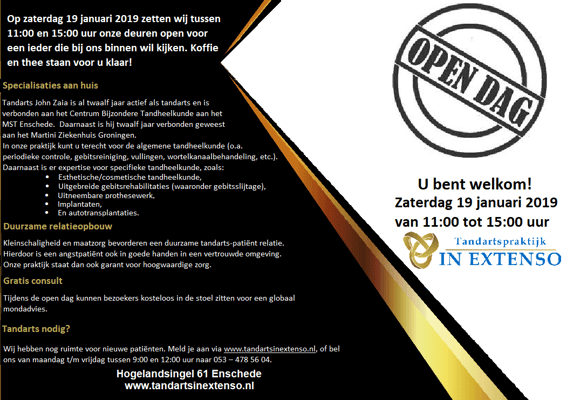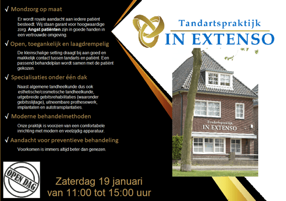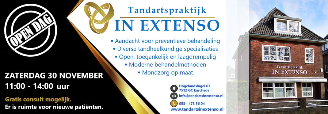 Kom op zaterdag 30 november tussen 11:00 en 14:00 uur naar de open dag van Tandartspraktijk In Extenso, een moderne praktijk met een ervaren tandarts en (preventie)assistentes die zich met deskundige zorg over uw gebit ontfermen. Onze praktijk heeft een kleinschalige setting voor jong en oud, waarbij het leveren van maatzorg en preventie voor elke patiënt de boventoon vormt.