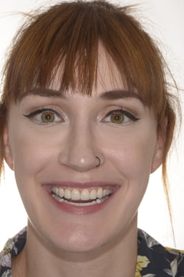 Onderstaande dame heeft verschillende restauraties bij haar voortanden gehad. Deze verschillen van elkaar in kleur en vorm. De hoge lachlijn werkt nadelig bij haar, omdat ze veel tandmateriaal laat zien.
