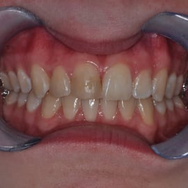Deze dame schaamt zich voor haar gebit. De grote voortand (11) heeft een composiet facing die niet mooi is. Daarnaast brokkelt deze vaak af. De kleine voortand ernaast (12) heeft ook een composiet vulling die opvalt door kleurverschil en geen juiste vorm.